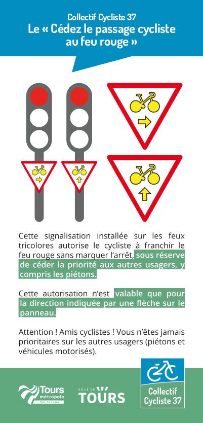 Ce panneau qui existe depuis 2010 en France, officiellement appelé « cédez-le-passage cycliste au feu », donne l’autorisation aux vélos à un feu de tourner à droite ou d’aller tout droit alors que le feu est rouge. Il ne dispense pas néanmoins du respect de la priorité envers les piétons. C’est le seul cas où il est possible de passer au feu rouge à vélo. Sinon, il s’agit d’une infraction qui entraîne une amende forfaitaire de 135€. Cette signalisation peut aussi se présenter sous forme de feux jaunes vélo clignotants, juste à côté des feux tricolores.