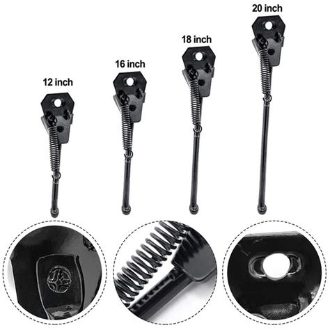 - Béquilles extensibles: Certaines béquilles sont extensibles. Différents systèmes d'extension existent. Un système courant consiste en deux tubes emboîtés qui peuvent coulisser, et sont retenus par une vis qui les traverse tous deux (ou qui permet de serrer une bague). Dans ce cas, on peut desserrer cette vis pour ajuster la longueur de la béquille. Il existe aussi des béquilles extensibles constituées de deux tubes métalliques emboîtés, et retenus entre eux par un système de plongeur identique à celui que l'on trouve dans certaines potences. La tête de la vis-plongeur peur alors être l'embout de la béquille qui touche le sol.