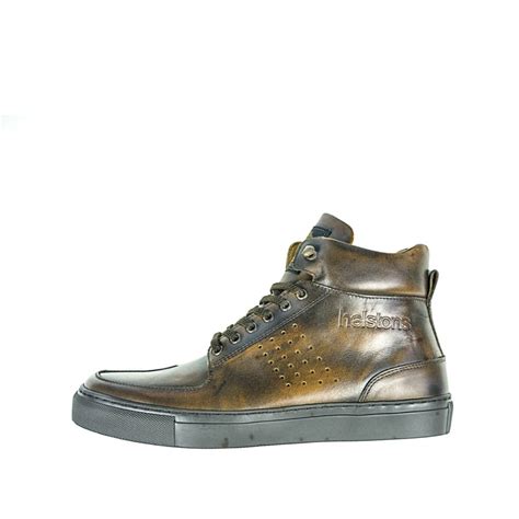 Les Helstons Glen sont conçues en cuir de vachette, une matière vous offrant une résistance optimale face à l’abrasion et aux déchirements. Les larges panneaux en cuir perforé de ses baskets moto apportent un maximum d’air en plein été. Le cuir a reçu un traitement imperméabilisant vous protégeant des intempéries.Ces chaussures homologuées CE incorporent une doublure en cuir fixe assurant un confort optimal durant les longs trajets. Cette paire de baskets moto dispose pour votre sécurité de protections des malléoles et d’un renfort de sélecteur pour une bonne durabilité du produit. L’enfilage est facilité grâce à des pattes en cuir à l’arrière de ces chaussures. Elles se ferment et s’ajustent grâce à des lacets. La semelle cousue blanc vieilli donne à ses chaussures à tige haute des faux-airs de Converse.