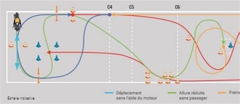 - Lorsque la roue arrière de la moto a entièrement franchi les cônes, il doit reculer selon le parcours défini par la fiche d’examen.