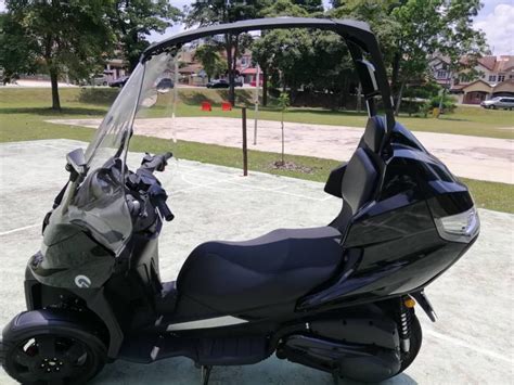 Au plancher on bénéficie du freinage couplé (obligation légale), mais le maniement de la pédale est malaisé, comme sur un Piaggio MP3 d’ailleurs. Sur le plan pratique, le 3 roues à toit offres des avantages qui le distinguent des autres scooters du segment. Son coffre est gigantesque (90 litres lorsque le toit est monté : on pourrait y mettre 3 intégraux !), il est équipé d’un essuie-glace et d’un pulvérisateur de lave-glace. On trouve aussi un frein de parking au centre de son guidon, une planche de bord agréable à deux compteurs analogiques et un pavé LCD central, un vaste vide-poche dans son tablier et deux prises USB sous sa selle.