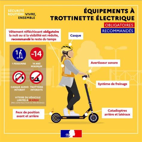 Depuis 2019, les trottinettes électriques sont régies par le Code de la route : minimum 14 ans, vitesse max 25 km/h. Vous pouvez rouler sur pistes cyclables et zones piétonnes (à 6 km/h max). Pas d'écouteurs pour rester attentif. Les équipements obligatoires incluent un casque, un gilet réfléchissant de nuit, un frein fonctionnel, un klaxon et des feux avant/arrière.